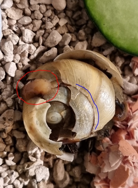 Ich habe gestern morgen eine Schnecke mit Gehäuseschäden gefunden und sie mitgenommen und auf Kalk gesetzt und ihr verkleinerte Eierschalen angeboten (auch Löwenzahn, Gurke, halte sie feucht etc), welche sie auch angenommen hat und sie hat auch bereits gestern Abend einen Riss des Häusschens repariert gehabt, siehe blauer Streifen. Ich sehe aber ansonsten keine Bewegungen der Schnecke und bin mir nicht sicher, ob die Gehäuseschäden allenfalls zu gross sind und ob die Schnecke überhaupt noch lebt. Auch macht mir Sorgen, dass allenfalls ein Organ rausschaut, siehe roter Kreis, und sie dieses allenfalls nicht mehr ins Haus hineinbringt. Ich habe heute die Eierschalen noch weiter zermörsert und mit Wasser befeuchtet und nochmals ganz nah an sie beim Fuss hingelegt. Was denkt ihr, hat die Schnecke Ueberlebenschancen?