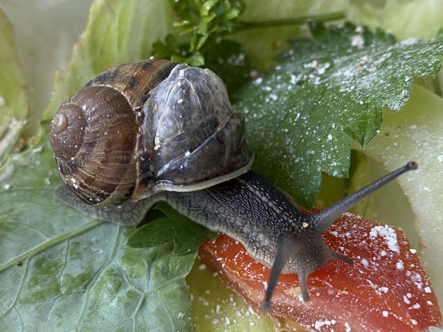 Es ist ein großes Stück vom Eingangsbereich abgebrochen. Ich habe sie in eine Eisbox gesetzt mit Salat, Gurke, Tomate, Petersilie, Brennesselblatt, Löwenzahn und einem Brei aus eingeweichten Haferflocken und zerstoßener Eierschale. Ein Kohlrabiblatt habe ich heute auch vom Einkaufen mitgebracht. Die Schnecke ist recht aktiv, kriecht am Deckel entlang und hängt sich dort auf, hat aber offensichtlich nichts gefressen.