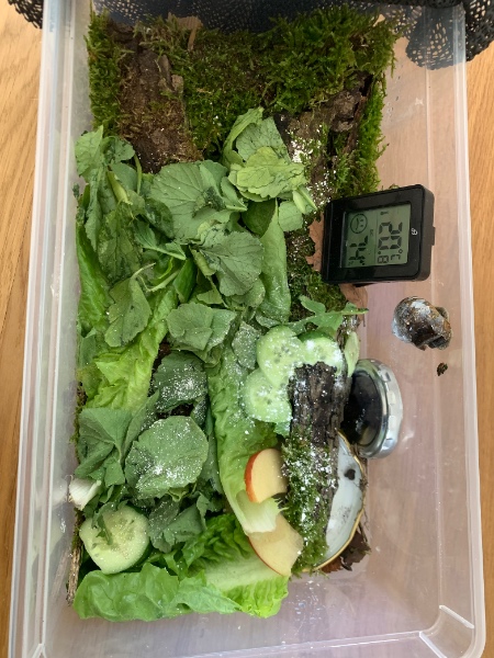 ich pflege seit ca. einer Woche eine verletzte Weinbergschnecke (kaputtes Häuschen). Sie lebt aktuell in einer Box (L: 30 cm, B: 15 cm, H: 12 cm) mit Walderde, Moos und Baumrinde. Seit Kurzem frisst sie Gurke (mit Eierschalen- und Calciumcarbonatpulver). Sie sitzt meist ruhig, klettert aber gerne an der Wand.