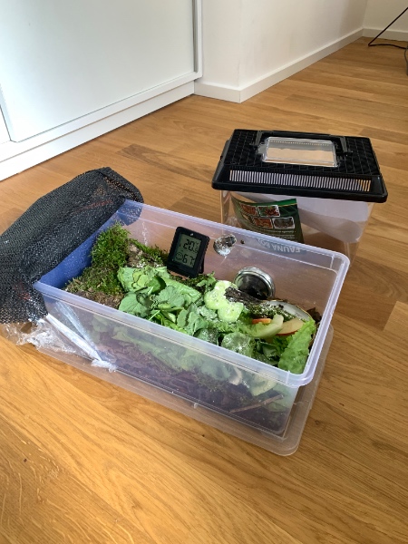 Die bestellte Faunabox (L: 19 cm, B: 12 cm, H: 15 cm mit Deckel) ist leider kleiner als erwartet. Da ich bald in den Urlaub fahre, wird meine Mutter sich in der Zeit um die Schnecke kümmern. Ich möchte vorher alles gut vorbereiten.