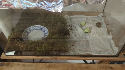 Zum Trinken haben die beiden eine Untertasse in der ganz wenig Wasser steht, damit sie nicht ertrinken und zum futtern haben sie momentan etwas Gurke.