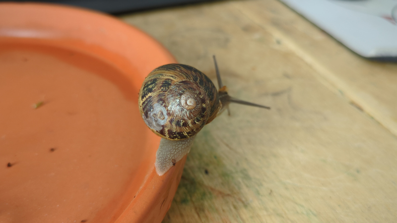 Dann frage ich mich inzwischen, ob ich Bubba nicht ein bisschen übereilig eingesammelt habe. Sie hat zwar etwas gebraucht, bis sie sich aus dem Haus getraut hat und sitzt schon länger recht bewegungslos an einer Stelle, aber da Schnecken nachtaktiv sind, könnte es ihr auch einfach zu früh sein. Alles in einem könnte ich mir vorstellen, dass ich sie nicht unbedingt da behalten muss. Soll ich sie morgen wieder aussetzten, wo ich sie gefunden habe, oder ist es vielleicht auch ganz nett, wenn Hubba nicht allein bleiben muss? Auch, wenn ich mir schwer vorstellen kann, das Schnecken ein ausgeprägtes Sozialleben haben.