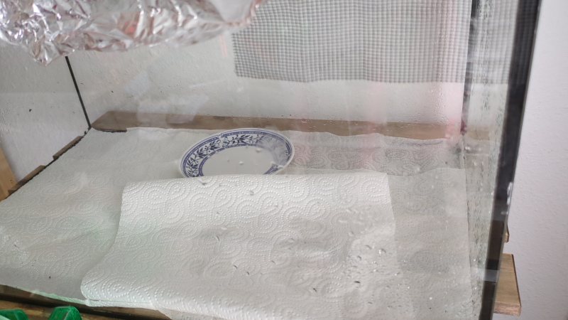 Ich habe mich ein bisschen belesen, und gegensätzliche Informationen zur Einrichtung des "Terrariums" gelesen. Viele Artikel empfahlen Erde und Moos einzubringen, um die Luftfeuchtigkeit schön hoch zu halten.