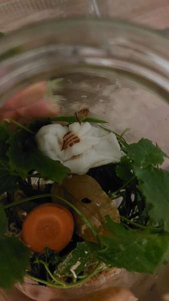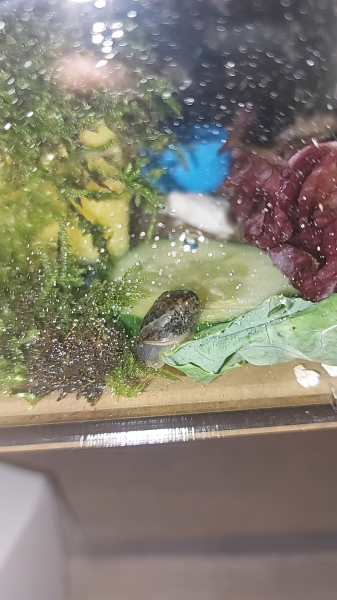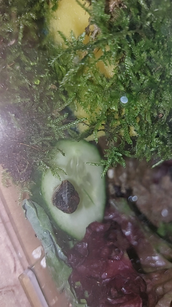 Am zweiten Tag habe ich sie umgesetzt in ein kleines Terrarium, da habe ich ein vollgesaugten schwamm drin und darauf Moos gelegt, sie hat noch eine kleine Wasserschale, Salat und ein kleines stück von einem Sepia Stein. Von allem bisher aber nichts angerührt. Ich sprühe das Terrarium 3 mal am Tag ein bisschen ein damit schnecki nicht austrocknet. Es fängt aber auch an ein bisschen zu muffen, sprühe ich zu viel oder ist schnecki gestorben? Kann ich sonst noch was tun?