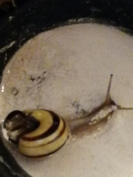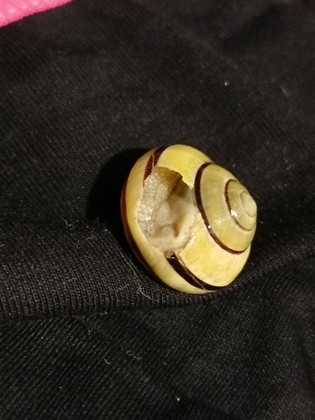 seh ich auf einem Stück aufgetautem Weg von weitem was gelbschwarzes liegen...also so ca 5 Meter vor uns, mein erster Gedanke...sieht aus wie ne Bänders...verwarf den Gedanken aber gleich, da Schnee, da kalt, kein Schneckenwetter. Wir schlappen also weiter und ich guck und guck und trau meinen Augen nicht. Da liegt eine Bänderschnecke! Mit Gehäuseschaden!So...hab sie dann zuhause untersucht, sie lebt, der Schaden sieht frisch aus, allerdings ist sie sehr weit zurückgezogen, bewegt sich aber. Ich hoffe sehr sie packt es und kommt aus der "richtigen" Öffnung