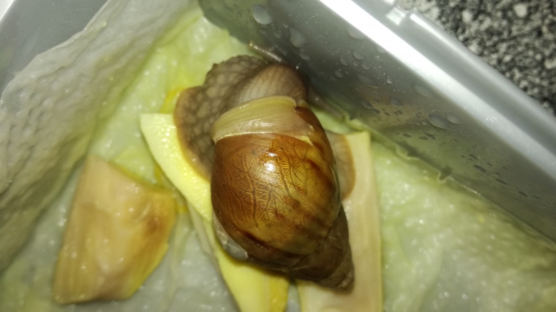 Sie hat ihren Transport zu uns nicht gut überstanden, ihr Häuschen ist seitlich in der Größe eines 2cent Stücks rausgebrochen der Mantel ist intakt. Erstehilfe habe ich in Form eines Seemandelbaum Bades geleistet. Dann kam sie in ein seperates schälchen auf zewa mit zucchini, sepia und eierschalen brei.