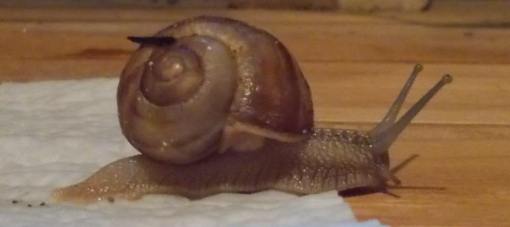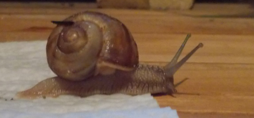 Inzwischen könnte ich auch wieder in Bildern rummalen, aber weil meine pomatia sich im Laufe der Jahre angewöhnt haben, erst sehr spät in den Winterschlaf zu gehen, habe ich eben eine beim Süsskartoffelraspln fotografieren können.