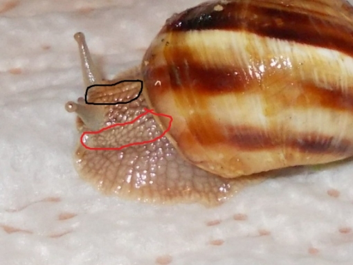 Was ist das auf dem Kopf, was ich schwarz umrundet habe? Ist das auch ein Rallye-Streifen, welcher nur bei den Helix lucorum und Helix pomatia auftritt?