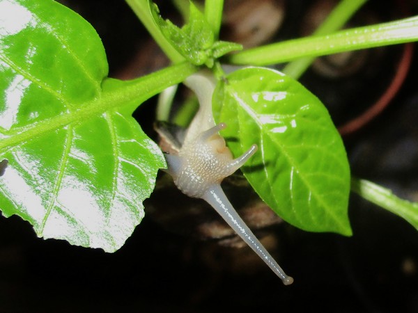 Vorige Woche habe ich das Terra mal so einigermaßen geputzt. Das Problem dabei war, dass die Schnecken alle an drei Wänden verteilt klebten und schliefen, also habe ich versucht, vorsichtig rumdrum zu wischen. Die Vorderseite war schneckenfrei, da konnte ich zumindest für mehr Durchblick sorgen. Aber natürlich wurden die anderen nach und nach wach... Am Ende war jedenfalls der Boden wieder gut angefeuchtet, die Kletterzweige neu angeordnet, Badeschale und Futterschüssel gefüllt und als Bonus ein Töpfchen mit Paprikapflänzchen reigestellt, das jetzt einige Wochen bei mir stand und gut gefüllt war.