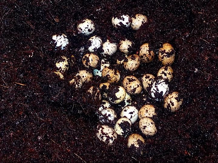 Alle anderen Eier in einer weiteren Mulde, aber ob aus allen noch was schlüpft, scheinen doch einige alte dabei zu sein (die dunkleren Eier).