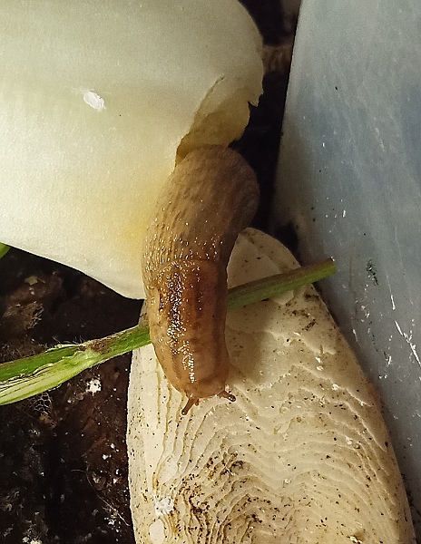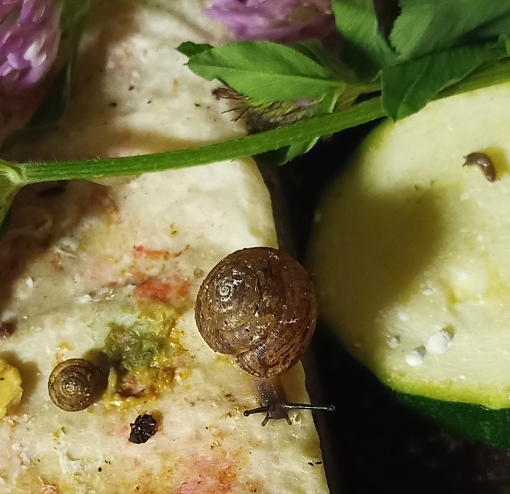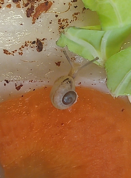 Total winzig, mit vorne weit abgebrochenem Häuschen. Draußen wars Winter, also mußte sie bleiben. Mit ihr zusammen saßen noch 3 kleine Nacktschnecken im Wirsing.