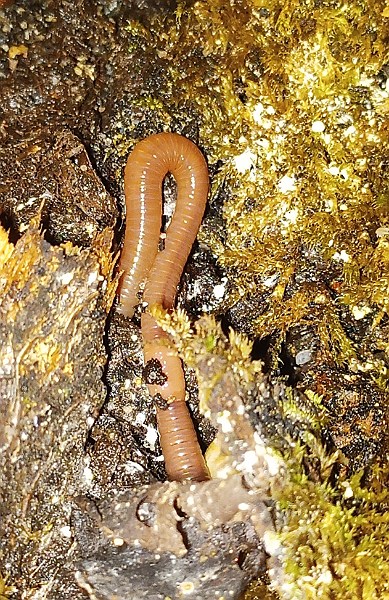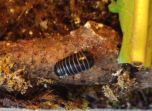 Als Bodenpolizei habe ich eingesetzt 2 Regenwürmer, einige Tausendfüßer, Asseln und Bandfüßer (meine Lieblinge, Würfelchen genannt weil sie aussehen wie eine Kette aus kleinen Würfelchen). Der Rest der Bewohner kam mit dem Laub und Moos mit, nicht unbedingt alles willkommen...