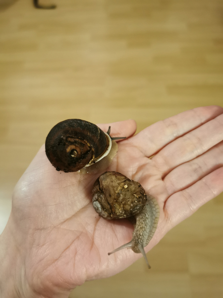 Im August habe ich dann noch eine Cornu Aspersum (ich denke zumindest dass es eine*ist) mit geplittertem Häuschen gefunden und sie zu meiner Helix dazu gesetzt. Ehrlich gesagt dachte ich sie* wäre auch eine junge Helix. Mittlerweile ist sie* gewachsen und ich denke sie* ist eine Cornu Aspersum. Eigentlich hatte ich gehofft beide vor dem Winter wieder aussetzen zu können, aber das Häuschen von Brunhilde (der Helix) ist noch etwas dünn und auch sehr unförmig.