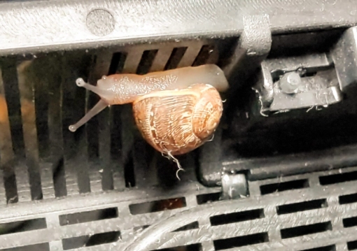 Da ist sie am 8.1.24 eingezogen. Sie ist erstaunlich aktiv und frisst mit Vorliebe Brennessel, Fischflocken und Schneckenfutter der Aquarienschnecken. Natürlich wird das entsprechend eingeweicht. Die Faunabox wird täglich befeuchtet.
