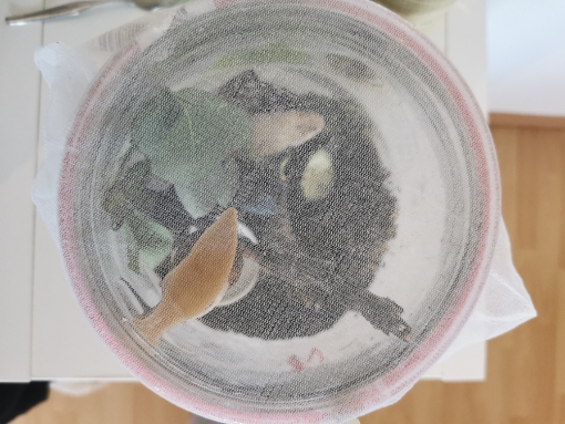 Es ist nicht riesig, aber größer als ein Einmachglas. Ich hatte ihnen ja extra ein Faunarium gekauft, doch dann haben beide nicht mehr gefressen und die Helix ist leider gestorben. Siehe Text weiter oben. Das Glas verschließen ich mit einem dünnen Netz.