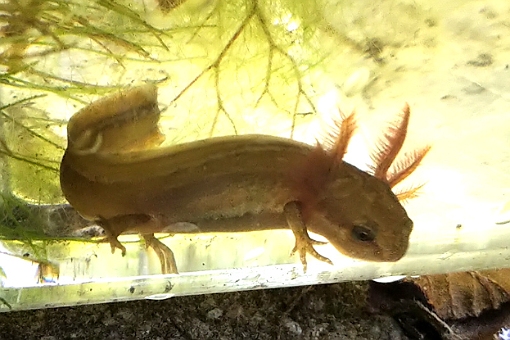 Die Geschichte im Miniteich ging aber auch tatsächlich noch weiter: Wie ich gerade so in den Teich gucke und mit der Lupe nach Schnecken suche, kommt plötzlich ein Reptilienkopf heraus - ich dachte noch so: Mensch, was für ein Zufall, dass ich ausgerechnet mitbekomme, wie Knoppi dem Teich entsteigt... das war aber gar nicht Knoppi, sondern eine Ringelnatter!!