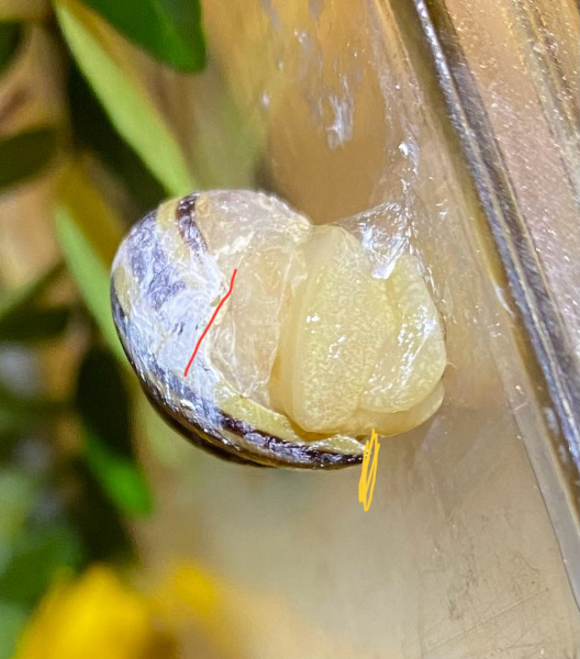 nabel- u unterseite scheint ganz gut repariert zu sein. und vorne am hauseingang hat sie auch eine harte u wohlgeformte schicht immerhin bis zur zweiten bruchkante (gelbe linie) gebaut.