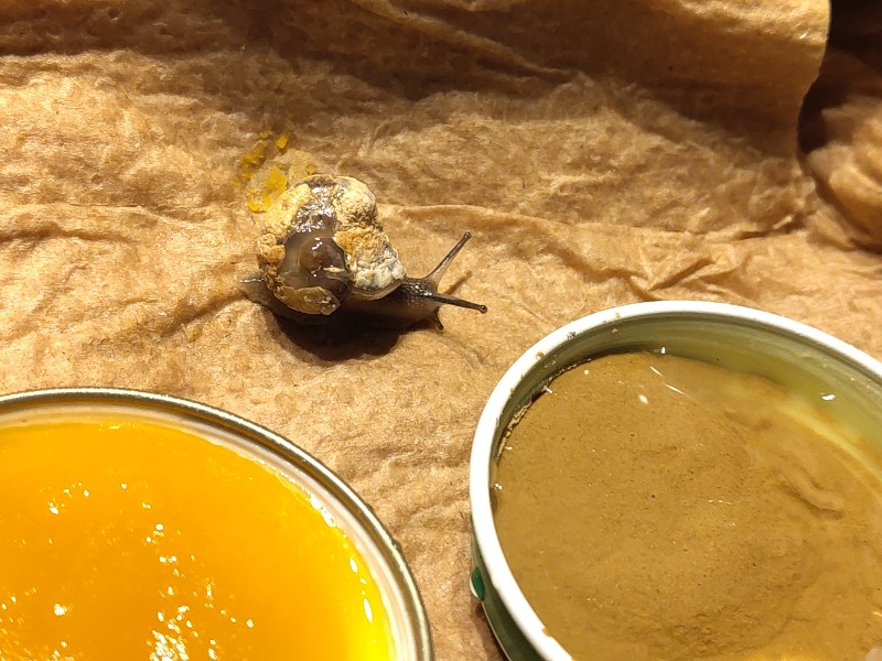 Das ist eine wilde Mischung da auf ihr drauf. Erst hatte sie sich ja selbst in einer Mischung aus Karottenbabybrei und Kalk gesuhlt, deswegen ist einiges auf ihr rosafarben. Dann kam der Eischnee, der ja aber zum größten Teil dann wieder verschwand, und vorne, wo die Gehäusemündung wäre, habe ich reinen Kalkbrei drauf getan.