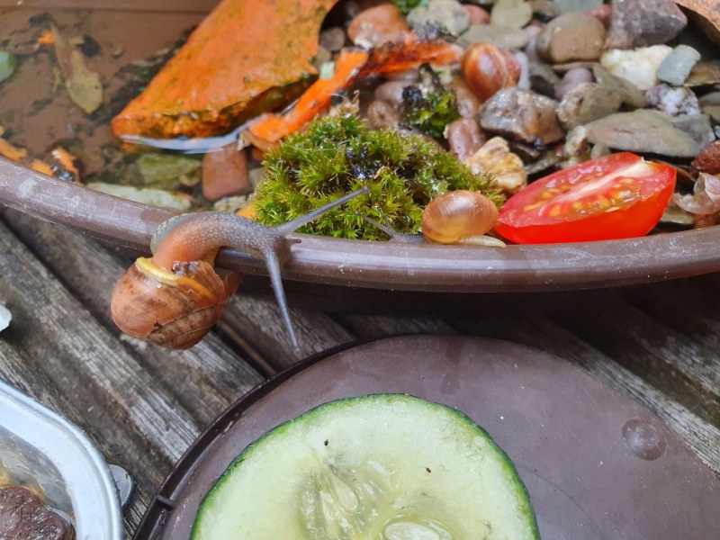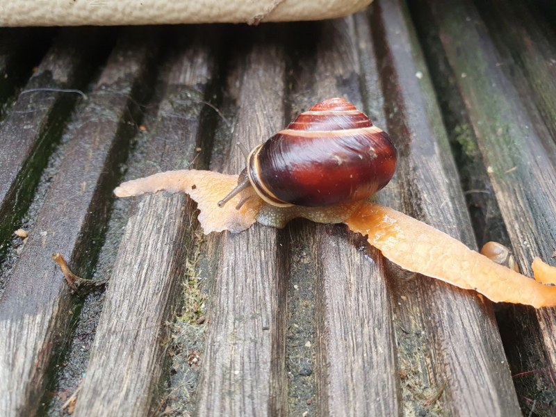 Mein Balkon ist kein Ort für eine Laubschnecke, denke ich, es gibt auch keine Artgenossen. Leider ist der Vorgarten sehr sandig und trocken, nicht ideal und die Taglilie wohnt jetzt auch nicht mehr dort. Aber darüber thront ein Baum, ein Eschenahorn mit hellem Laub, Südseite. Am Ende meines Balkons steht ein Ahorn mit dunklem Laub, Nordseite.