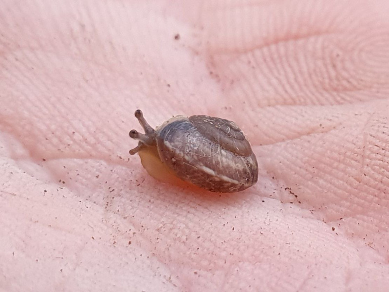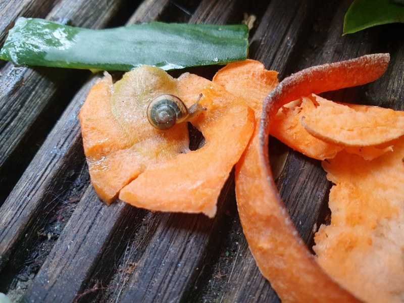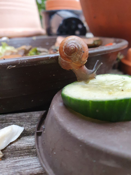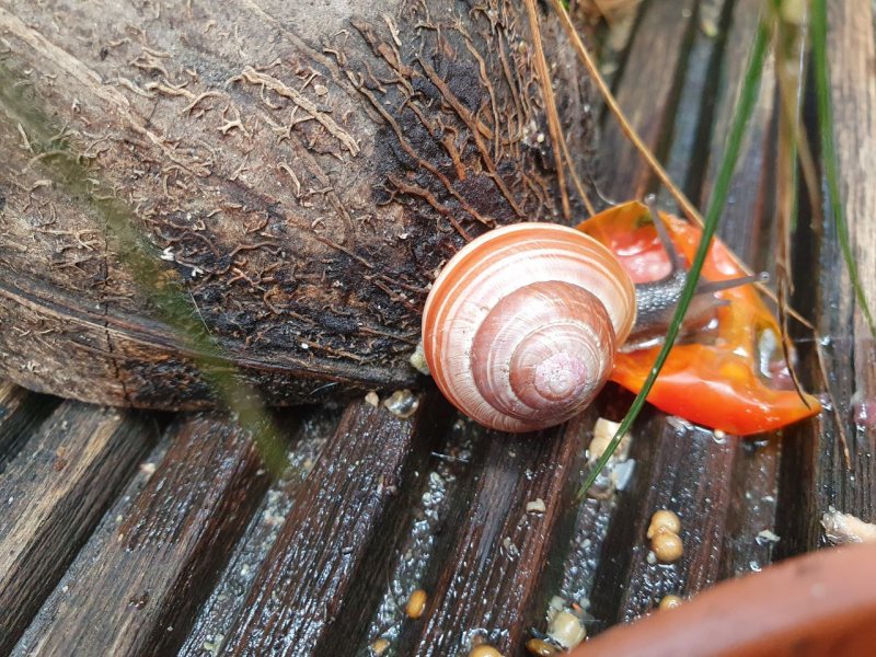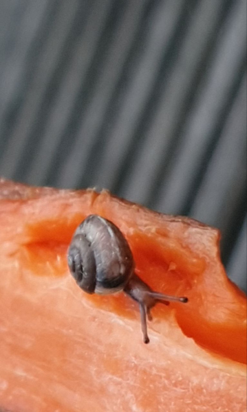 Heute habe ich mich einer Taglilie angenommen, die im Vorgarten ein karges Leben führte. Auf meinem Balkon setzte ich die Pflanze in neue Erde und einen eigenen Blumentopf. Beim abbrausen der Erde von den Blättern fiel mir ein brauner Fleck auf, der sich nicht wegspülen ließ. Bei genauerem Hinsehen entdeckte ich ein Minischneckchen. Ein Laubschneckchen?