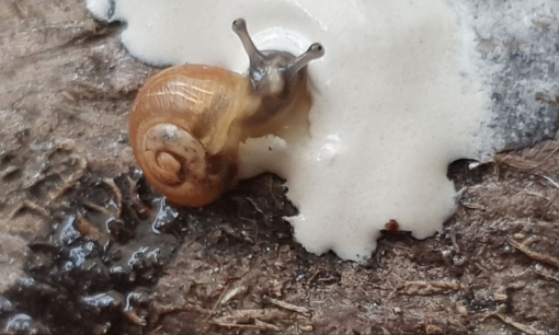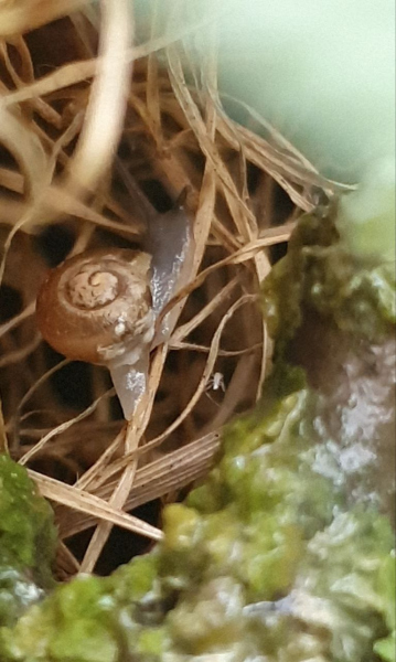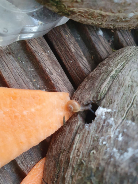 Die neue Winterkiste wird auch schon bewohnt, hoffentlich kann man es auf dem Bild erkennen, wie die Schneckis sich langsam just eben aus dem Bett auf den Weg zum Buffet machen: