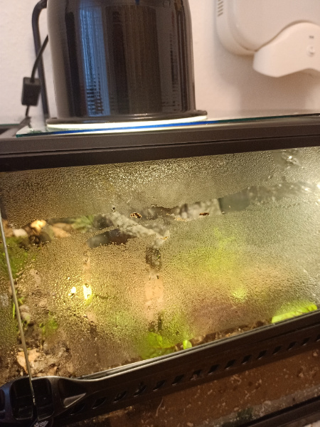 Ich bin nun stolzer Besitzer einer Tigerachatschnecke und einer achatia fulcia. Leider läuft es nicht so, wie ich es mir gedacht habe. Irgendwie scheinen sie sich in meinem Terrarium nicht wohlzufühlen. Ich habe eine heizmatte an der Seite angebracht und eine infrarotlampe oben. Ich habe nie die richtige Temperatur hinbekommen, sie war allerhöchstens 20°. Deshalb habe ich eine altbackene Glühbirne über das Terrarium gehängt. Seither erreiche ich tagsüber 24° und wenn ich morgens aufstehe und nach sehe( in der Nacht läuft nur die heizmatte 17W) bin ich bei 21 Grad. Meine Schnecken bewegen sich nicht und fressen nicht. Die eine vergräbt sich und bleibt vergraben, die andere kriecht mal 10 cm in der Nacht. Fressen tun sie nicht. Ich habe schon die luftschlitze unten aufgemacht-meine Vermutung ist dass diese noch zu winzig sind. Oben habe ich jetzt alles zugemacht, vorher war der größte Teil mit glasplatten abgedeckt. Ich habe nun wieder die infrarotlampe angemacht. Ich weiß nicht ob das richtig war, aber ich habe die Vermutung, dass es ihnen zu hell war. Nun habe ich wieder nur 21°. Der Boden ist leider noch nicht auf gekalkt-bio-erde-da ich gelesen hatte, dass man dies nur machen muss, wenn man Nachwuchs erwünscht. Kokos Erde und aufkalkung Pulver ist nun bestellt. Alles kommt aber erst am Mittwoch, mit den springschwänzen und den regenwürmern. Bis dahin brauche ich eine Notlösung. Ist es richtig, dass ich den Schnecken als Übergang eine Kreide anbieten könnte als Kalk Lieferant? Ich habe auch über mangelnde luftzufuhr gelesen, und dass man sie warm abduschen soll und testen soll, ob sie dann raus kommen und fressen. Dies habe ich gemacht und tatsächlich die fulcia ist tatsächlich herausgekrochen und hat jetzt auch Gurke gefressen. Anscheinend ist das Problem das Terra. Über die Luftfeuchte kann ich leider auch noch nicht sagen, da das hygrometer auch erst am Mittwoch kommt-das was ich vorher drin hatte, ist leider kaputt gegangen. Was kann ich jetzt bis Mittwoch tun, dass meine schneckis in der Nacht herauskommen und fressen und nicht an ihrem eigenen ausgeatmeten giftstoffen versterben? Bitte helft mir!
