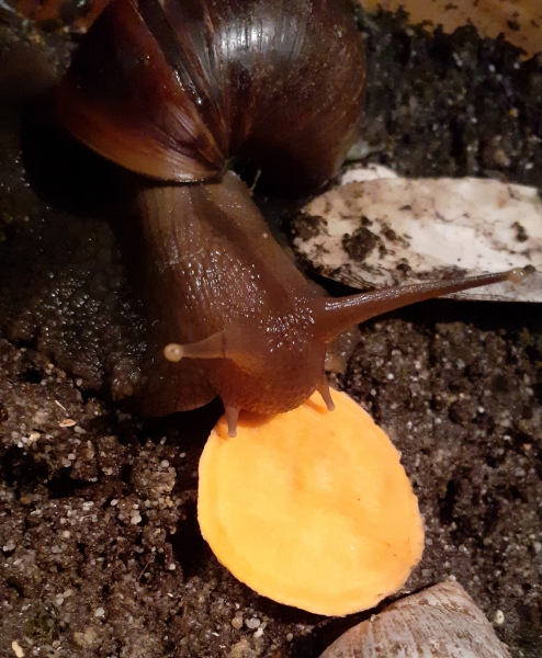 Seit heute morgen sitzen meine Schnecken jetzt abwechselnd vor dem Futternapf und gucken die Süsskartoffelscheibe an, dann fressen sie was anderes und das Ding liegt immer noch unberührt da.