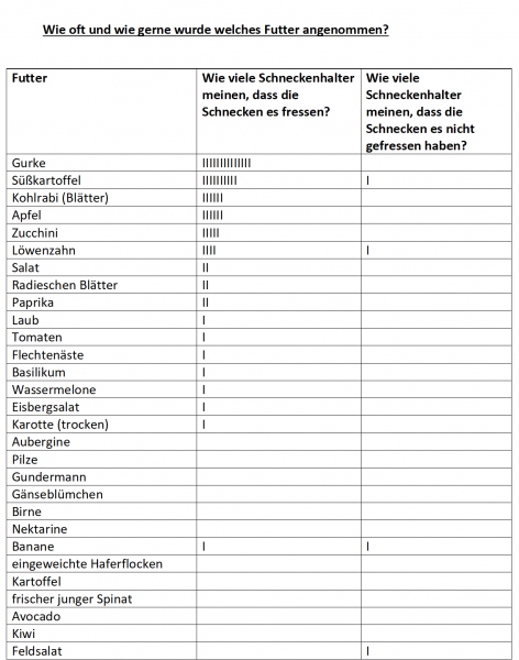 Meine lieben Flechten über alles. Ansonsten werden Karotte, Gurke, Brokkoli (muss alles frisch, saftig und knackig sein; getrocknet wird es ignoriert), Weidentriebe, Grastriebe, Löwenzahnblüten und Golliwoog ratzfatz weggemuffelt. Karotte gibts nur in bio, weil die konventionellen mir einfach überhaupt nicht schmecken. Meine Schnecks bekommen ja quasi meine Reste - oder besser: ich teile mein Essen mit ihnen. ^^