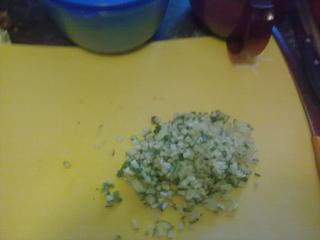So, das Pulverchen (3 EL) mit kochendem Wasser übergossen, dazu ist etwas von der frischen Petersilie und ein Stück Gurke in kleinen Würfeln. Das alles gut durchgezogen und lauwarm, wird nun serviert .