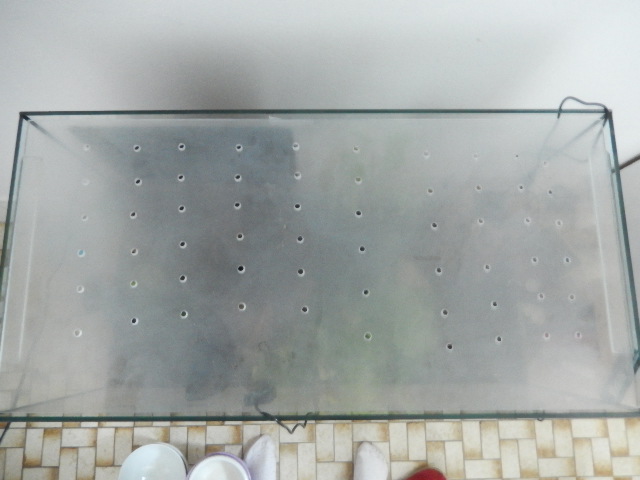 Hier ein Bild von meinem Plexiglasdeckel (ich habe derzeit ein Aquarium 60x30x35), den ich alle paar Wochen wieder mal umdrehe, weil er doch beginnt durchzuhängen. Die Löcher habe ich mit Bohrmaschine mit einem Kegelbohrer gebohrt (damit kriegt man saubere Löcher ohne etwas scharfes an dem sich die Kleinen verletzen könnten wenn sie ihre kleinen Näschen u. Fühler reinstecken - da gibt es eine Anleitung im Internet), an den Seiten habe ich noch ganz schmale Spalten (da hängen die Fernfühler von Thermo/Hygrometer durch), das Plexiglas ist 5 mm dick, zum Beschweren (damit die Kleinen nicht ausbrechen können) stelle ich auf jede Ecke eine Müslischüssel:
