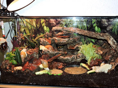 Im Becken hätte ich zusätzlich noch eine Schale mit Heilerde. Die Schnecken lieben es, im Heilerdebad zu graben und zu wühlen und sich mit breitem Fuß darin zu suhlen. Der Wasserfall wäre halt fließendes Wasser, würde etwas Bewegung in der Luft verursachen und wäre gut "beschleimbar". Er würde nicht dauerhaft laufen, sondern (mit Zeitschaltuhr gesteuert) zu Zeiten, in denen wir daheim sind. Einfach um reagieren zu können, wenn etwas sein sollte.
