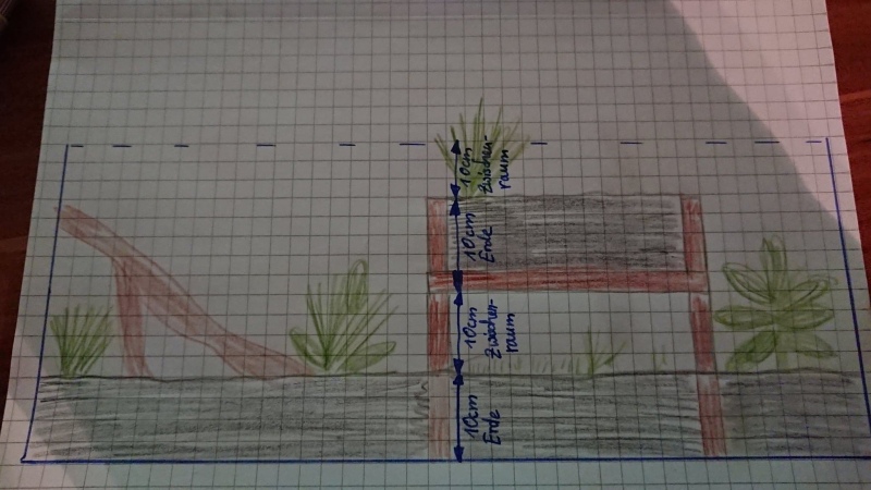 Meine Terrarien sind alle 40 hoch, bisher habe ich sie mit rund 10cm Erde gefüllt. Meine Idee war jetzt, aus kleinen Ästen und/oder Rinde und Kordel ähnlich wie beim Floßbau eine art Terrasse mit seperatem Becken für Erde zu bauen. Natürlich nicht auf der gesamten länge des Beckens, nur so 1/3 ungefähr. Wenn ich auch hier 10cm inklusive der Holzvorrichtung einplane, bleiben noch immer wie in der ersten Ebene 10 cm Luft zum rumschnecken. So wäre zum einen mehr Bodengrund zum Buddeln und schlafen da, ich hätte eine super Aussichtsplattform geschaffen, die Schnecks würden vielleicht nicht ständig an der Decke sondern "am Balkon" hängen und sie hätten ein Klettergerüst mehr...