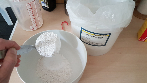 Im zweiten Schritt fülle ich Calciumcarbonat mit der großen Kelle in eine Rührschüssel.