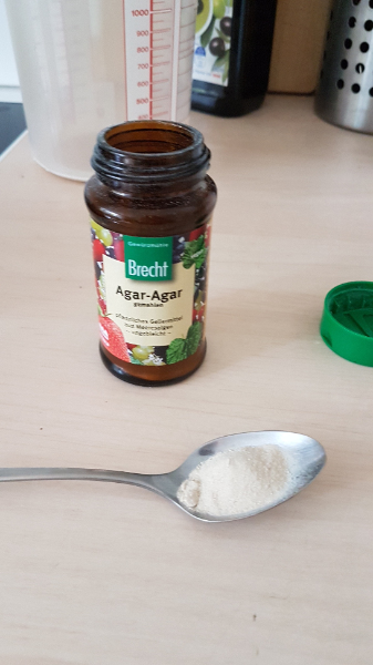 Zu den 400ml Wasser, welches ich in einen kleinen Topf gebe, messe ich etwas weniger wie ein Teelöffel AgarAgar ab