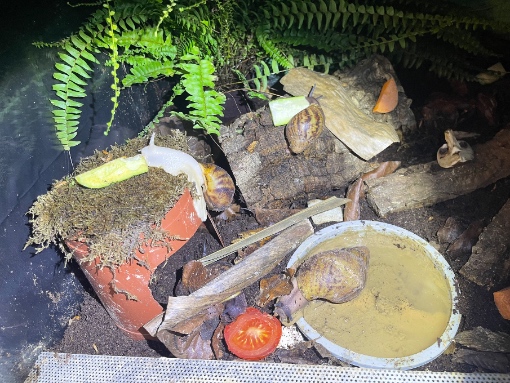 Im linken Bereich wo immer die Silikonschale mit Heilerde Matsch steht ist auch der Bodengrund mit zusätzlicher Heilerde versehen. Bei der Badeschale rechts ist er dafür etwas stärker aufgekalkt als im Rest des Terrariums. Das scheinen sie zu mögen, in der Natur ist der Boden ja auch nicht überall identisch was die Mineraliengehalte betrifft. Die Schnecken sind sehr agil und lieben ihren Matsch und auch die zugeschnitten Blumentöpfe und Rohre! (: