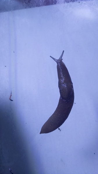 So und jetzt kommt's - weiter oben habe ich ja kurz den "mysteriösen Fund" erwähnt. Habe letztes Jahr im frühen Sommer in einem Gartencenter ein paar Blumen und Pflanzen gekauft und an einem Blumentopf hing eine kleine Nacktschnecke. Ich wusste nicht, welche Art das ist und ob sie überleben könnte wenn ich sie mit den neu gekauften Pflanzen einfach draussen lasse. Also habe ich sie in eines der Terrarien zu den Nudelschnecken gesetzt. Dort verschwand sie dann und ich habe sie sicher ein halbes Jahr nicht mehr gesehen. Bis zum Herbst, als plötzlich ein riesiges Alien sich zeigte