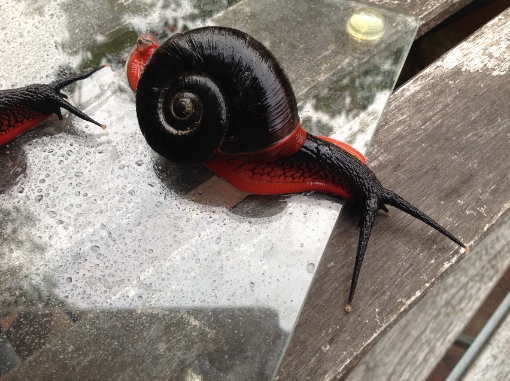 Das interessante bei der Platymma tweediei (auch -Feuerschnecke-) genannt ist, dass sich auf der oberseite der Fussspitze der Darmausgang befindet. Man konnte beobachten, dass frisch geschlüpfte Schnecken oft auf der Fusspitze der Elterntiere kleben und Kot fressen....