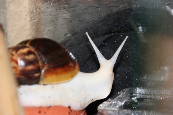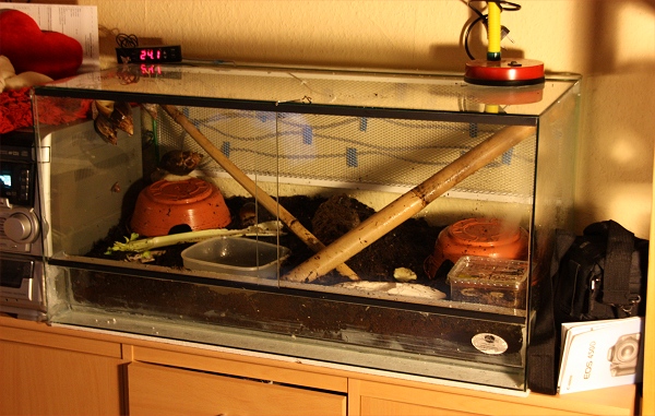 nach vielem hin und her ist nun auch endlich mein Schneckenbecken fertig, sodass ich es vorstellen kann. Es misst 80x40x40 und ist ein Standardglasbecken mit Heimchenfalle. Drin ist einfacher Kokosbrick mit Rindenmulch.