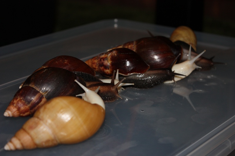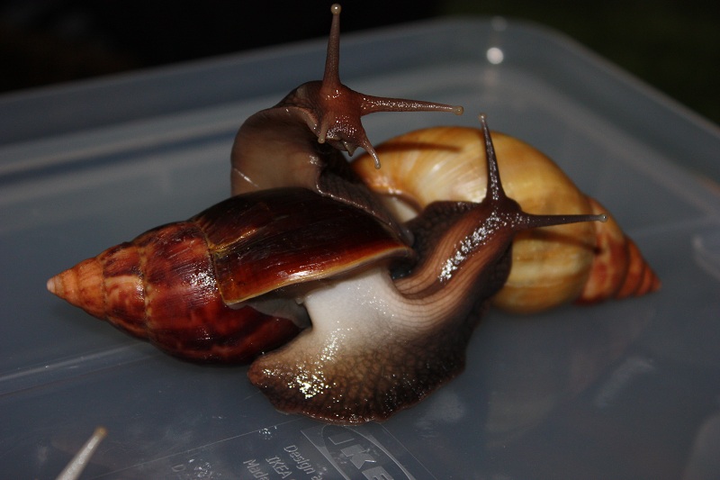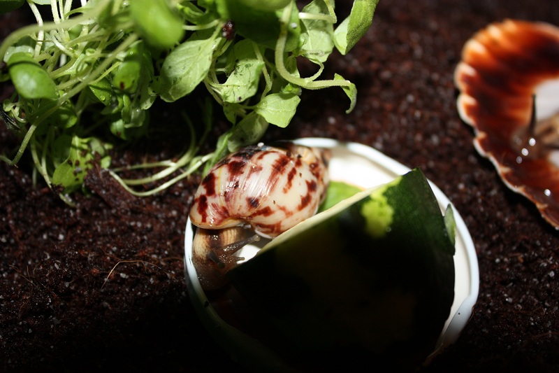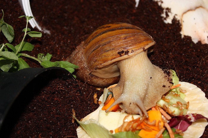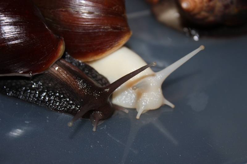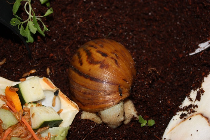 Gibt es ja gar nicht! Nachdem ich sie lange Zeit auf der Hand hatte und die Schnecke jeden Millimeter meiner Haut inspiziert hat, habe ich die Hand flach auf die Erde gelegt, um sie runterkriechen zu lassen. Und was macht sie? Rennt in Richtung Napf und schlägt sich die Wampe voll!! Huch!?