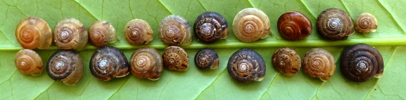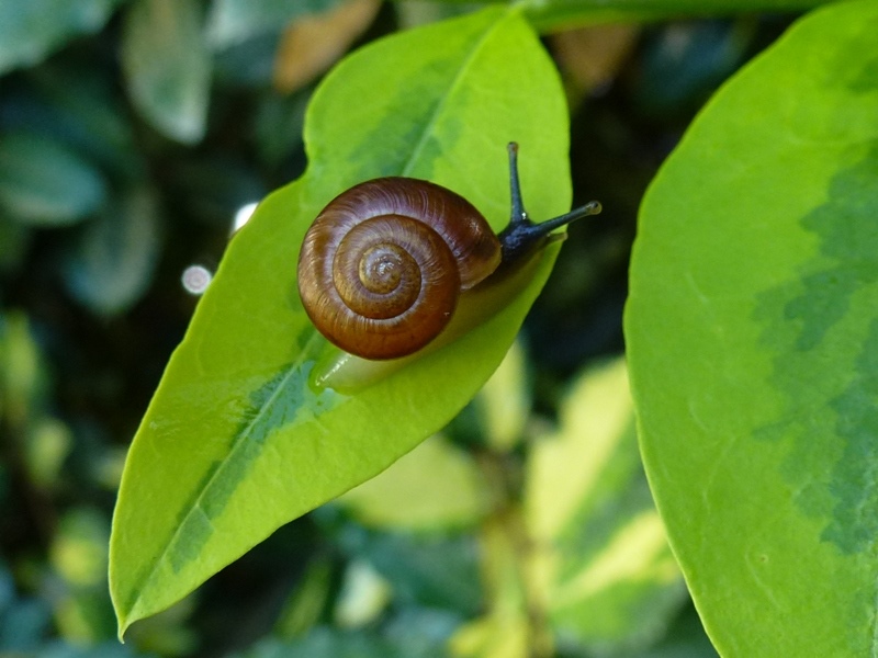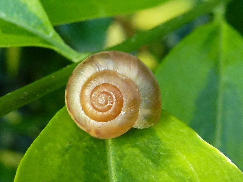 Darf ich vorstellen: Eine spitze Baumschnecke! Sie saß neben all den anderen Baumschnecken. Ich hoffe nun sehr, dass diese offenbar mutierte Gehäuseform genetisch vererbbar ist.