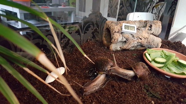 Du könntest die Belüftungsschiene aus Lochblech am vorderen Rand noch mit Moos bedecken oder mit Kork bekleben, dass die Schnecken sich nicht am Häuschen verletzen können, falls sie da mal doof drauf fallen.