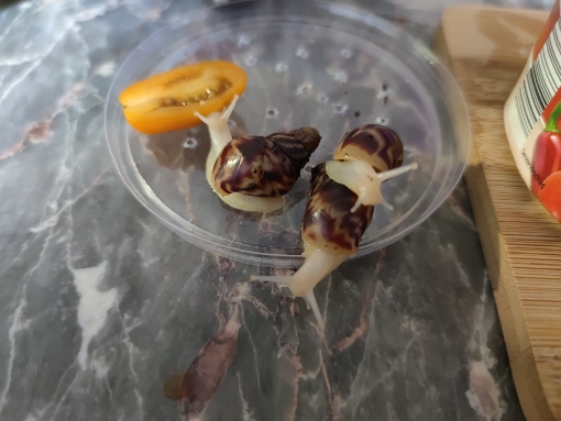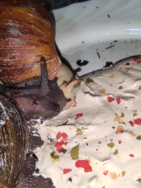 Hela, Odin, Thor, Loki und Heimdall sind Lissachatina reticulata albino.