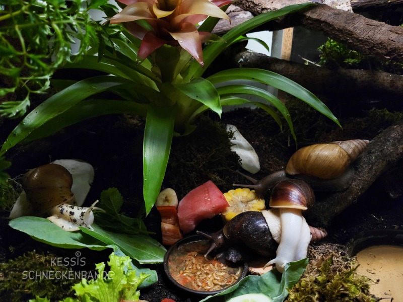 Die Pflanzen halten sich nun schon seit Anfang Mai (am 10.05. sind die Schneckis eingezogen) und keine ist seitdem zerlegt worden... sie lieben das Bäumchen und klettern fleißig dran rum (das die Schneckerei wiederum großzügig verzeiht und wächst und wächst und fast schon die Terrariendecke erreicht hat. Ich schätze, ich muss ihn demnächst ein bisschen cutten...