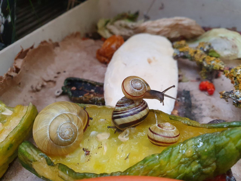Zwei Futterstellen habe ich eingerichtet, an denen die Schnecken Gemüse und Salat bekommen, aber auch Sepiaschale, damit gerade die Jungtiere ihr Häuschen für den Winter ausbauen können.