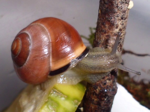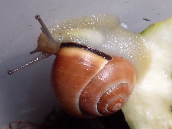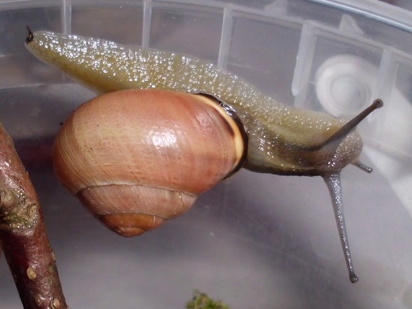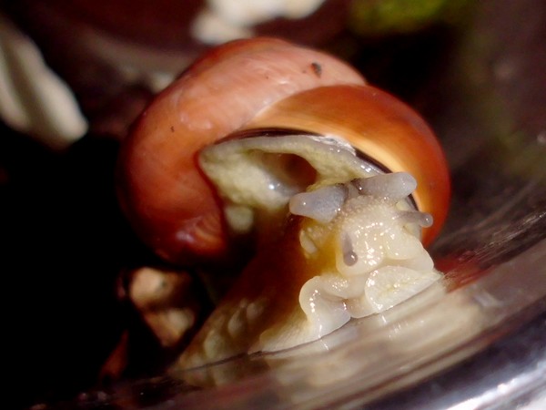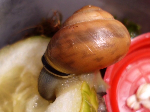 Und ein Knautschgesicht: die Schnecke mit der kleinen Beschädigung des Mündungsrands.