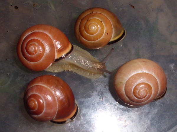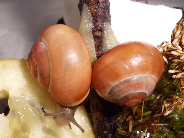 Hier habe ich noch einpaar Bilder von den beiden gestreiften. Das Haus der linken (die aus der ersten Dreiergruppe stammt) hat in der letzten Windung eine kleine Einkerbung, die Streifen gehen minimal versetzt weiter. Auf dem zweite Foto ist sie rechts, da kann man es etwas besser erkennen, diese frühere Bruchkante ist hier praktisch mittig.