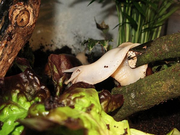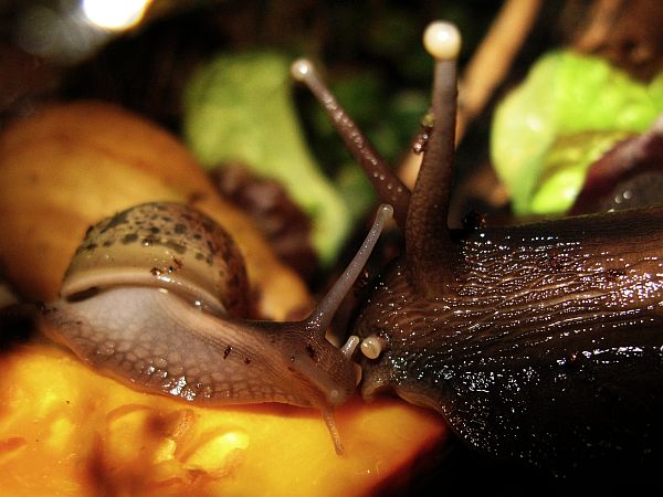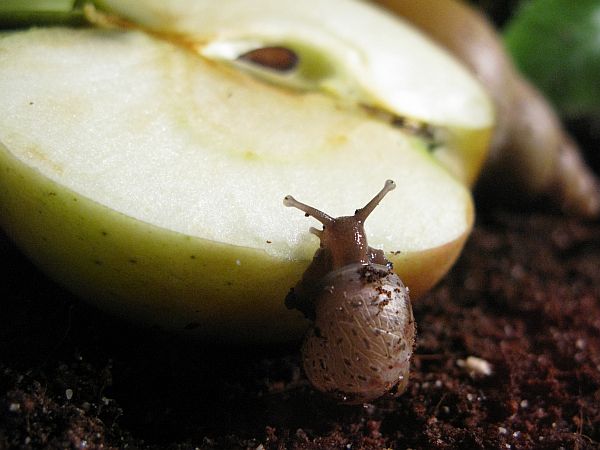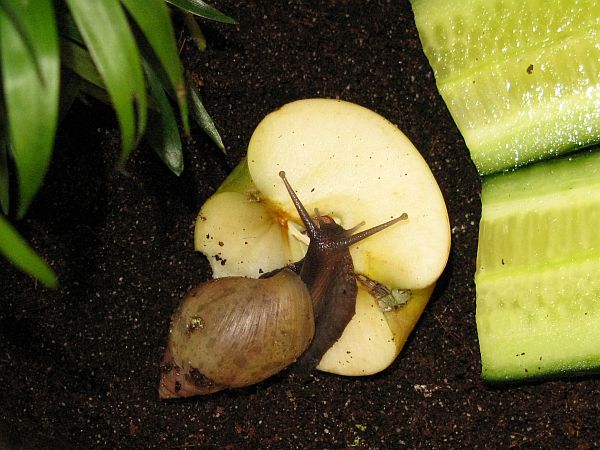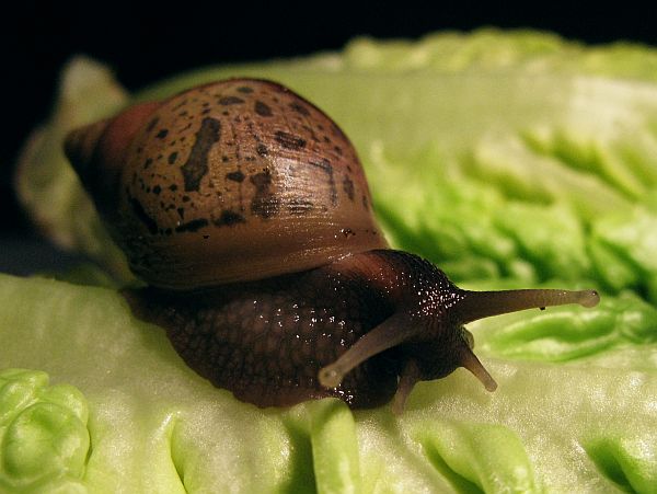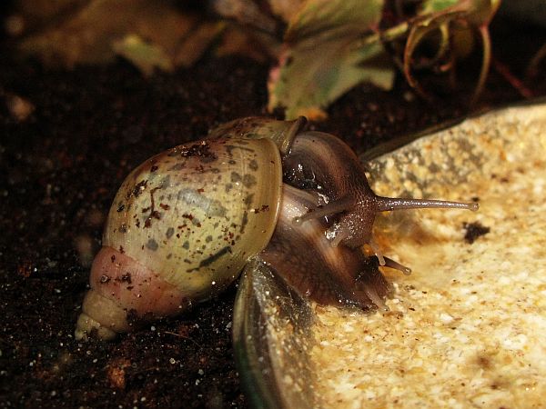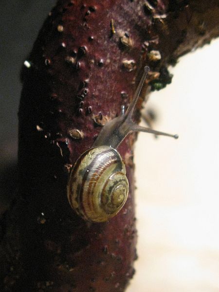 Die kleine gefleckte wird mal eine gelbe Schnirkelschnecke mit fünf schwarzen Streifen werden. Die Flecken kommen dadurch zustande, dass die Innereien noch durch das dünne Häuschen durchschimmern. Sie ist ~5mm groß. Sie und auch die anderen einheimischen Schnecken der letzten Seiten habe ich im Sommer mit ~3-4mm aus unserem Blumenkohl gepflückt. Diese Kleine ist leider kaum gewachsen im Gegensatz zu ihren Kumpeln.