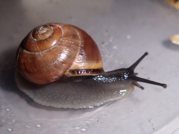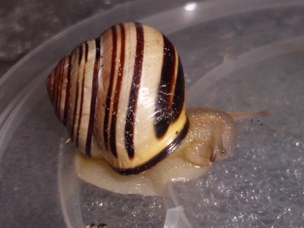 Neben einer Hecke lag dann diese hübsche Schnecke, die natürlich auch den Fototermin verschlafen hat. Sie hat einen hellen Weichkörper, der relativ gelb ist, man könnte sagen, passend zur Grundfarbe des Häuschens.