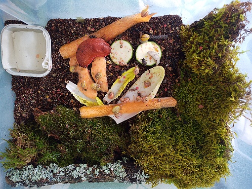 Und noch ein Stimmungsbild von der neuen Otala. Die hat sich sehr gut eingelebt, kennt schon die Badeschale und die besten Schlafplätze. Besonders gerne schläft sie im Laub.
