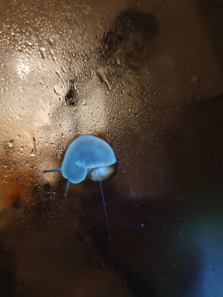 Hier wohne ich nun seit 26 Jahren, es kamen schon immer Schnecken auf meinen Everest geklettert. Seitdem ich aber keine Kraft mehr habe den Balkon zu schrubben, haben den Job die Schnecken übernommen und entfernen den Grünbelag von Dielen und Möbeln. Ok, sie machen das nicht in exakten Bahnen, hinterlassen dafür aber lustige Muster.